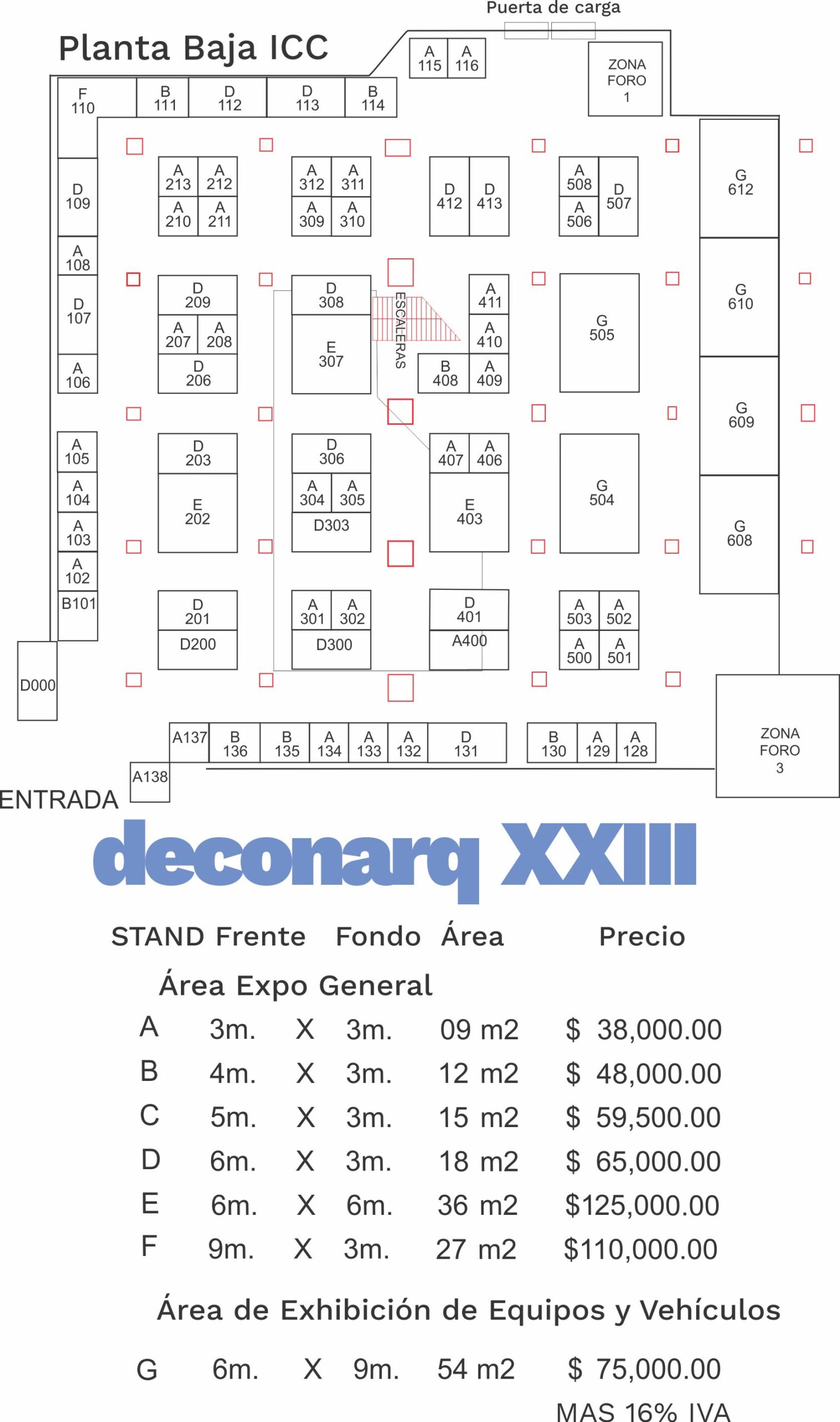 Plano de distribución de Stands Tipos de Stands Que incluye: Stand de Octanorm con:• Tres paredes laterales (trovisel blanco)• Antepecho rotulado (tipografía helvética)• Contacto eléctrico (110 volts)• Iluminación (lámpara slim line)• Servicios al expositor